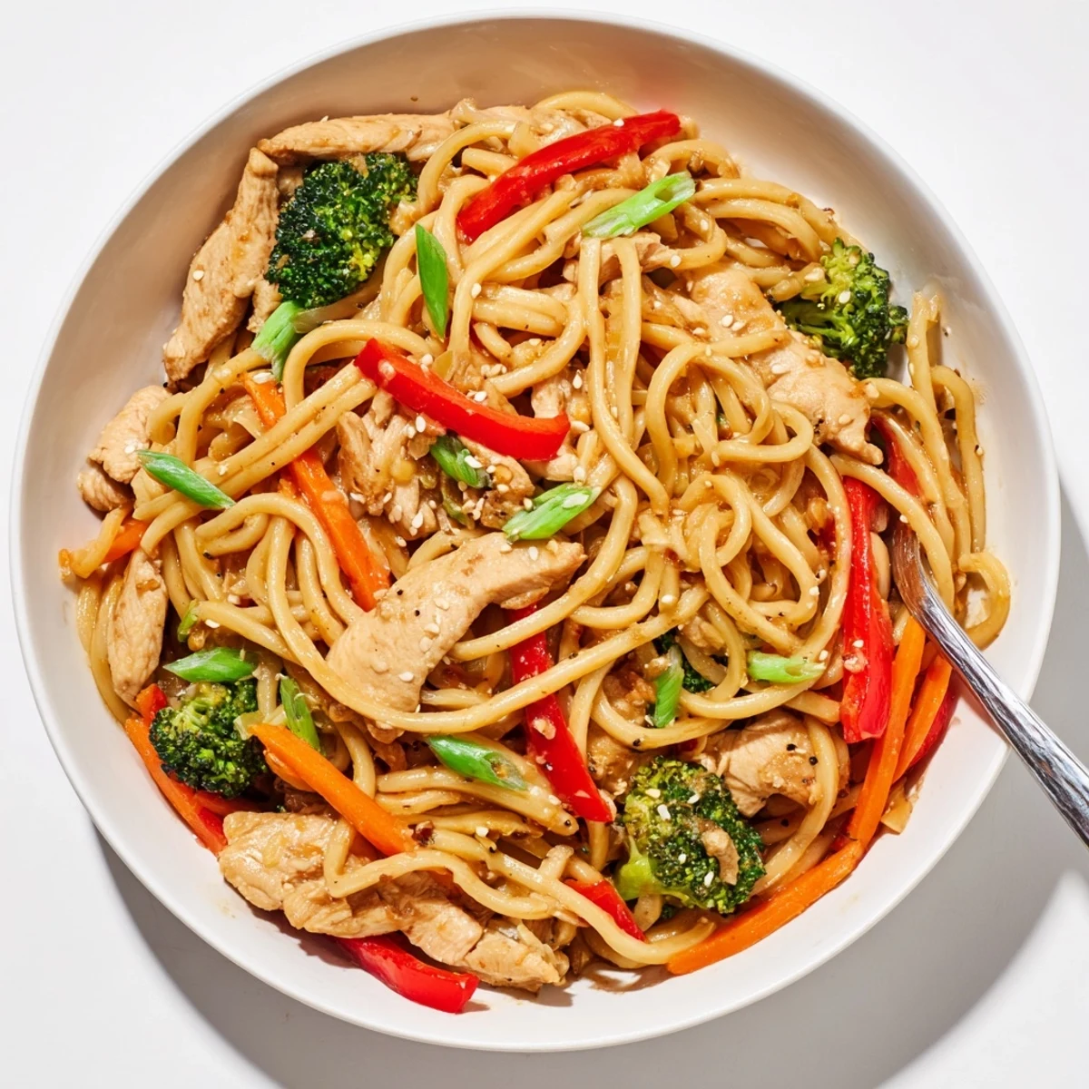 Ready in about 40 minutes, this lo mein combines thinly sliced chicken with broccoli, bell pepper and carrots, all tossed with lo mein noodles in a savory garlic-ginger sauce. Cook noodles first and set aside, stir-fry chicken until just cooked, soften vegetables briefly, then return everything to the wok and toss with the sauce to glaze. Finish with sesame oil and green onions for brightness; add snap peas or tofu for variation.