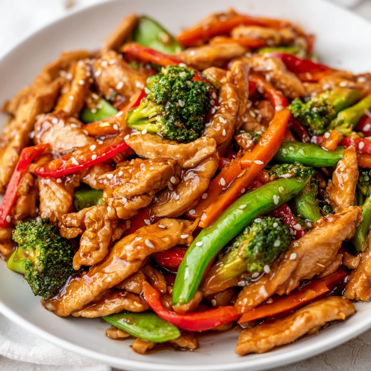 This vibrant dish features thinly sliced chicken breast stir-fried with colorful vegetables like bell peppers, broccoli, and snap peas. The savory sauce combines soy sauce, toasted sesame oil, honey, and rice vinegar for a perfect balance of salty, sweet, and tangy flavors. Ready in under 30 minutes, it's ideal for busy weeknights when you want something nutritious and satisfying without spending hours in the kitchen.