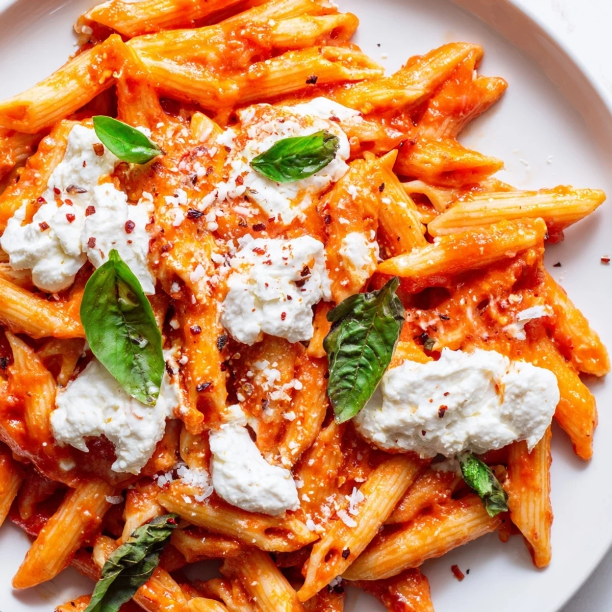 This vibrant Italian pasta combines tender penne with a rich garlicky tomato sauce, finished with creamy dollops of fresh ricotta and fragrant torn basil leaves. The dish comes together in just 30 minutes, making it perfect for weeknight dinners or casual entertaining.